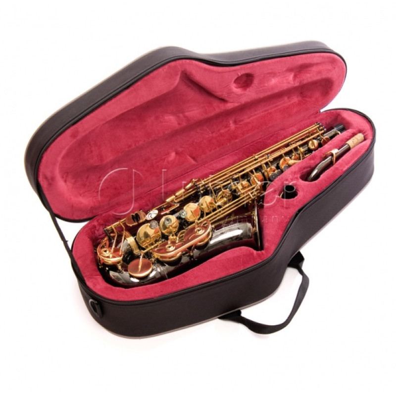 Саксофон поставляется со всеми необходимыми аксессуарами, включая мундштук, лигатуру, трость и легкий футляр с лямками и ремнем.