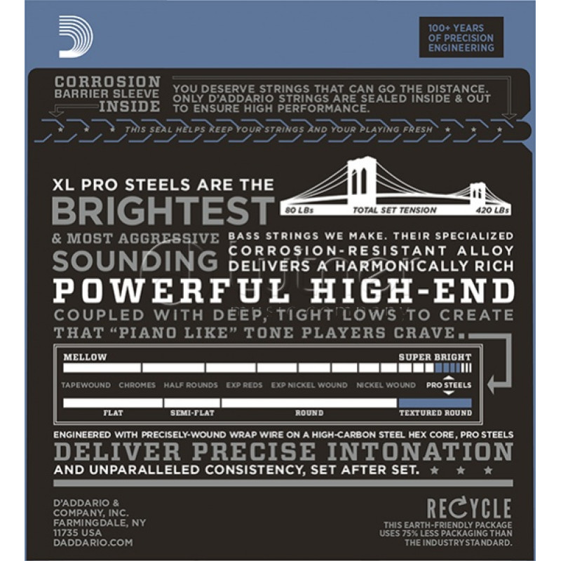 Струны линейки ProSteels обладают самым ярким звучанием и наибольшими магнитными свойствами из всех струн D'Addario для бас-гитар. Специальный сплав стали обеспечивает насыщенное гармониками, сверкающее звучание верхних частот и глубокие, плотные басы, что в сочетании создает «фортепианное» звучание, которого так жаждут музыканты. Струны ProSteels отлично подходят как для четкого перебора, так и для агрессивной игры медиатором, и дают дополнительную мощность звука, позволяющую вашей бас-гитаре выделиться из общего микса.