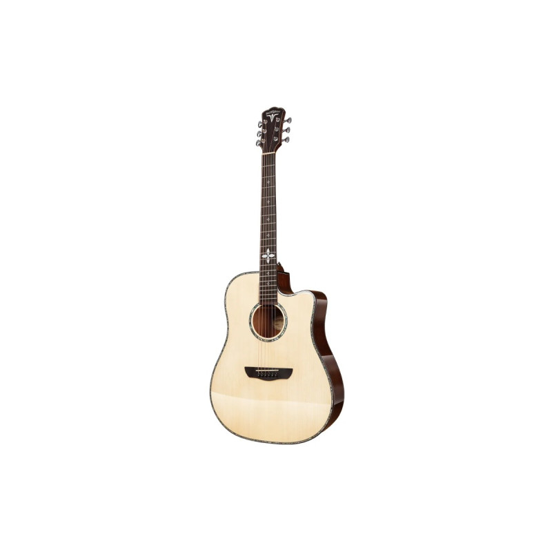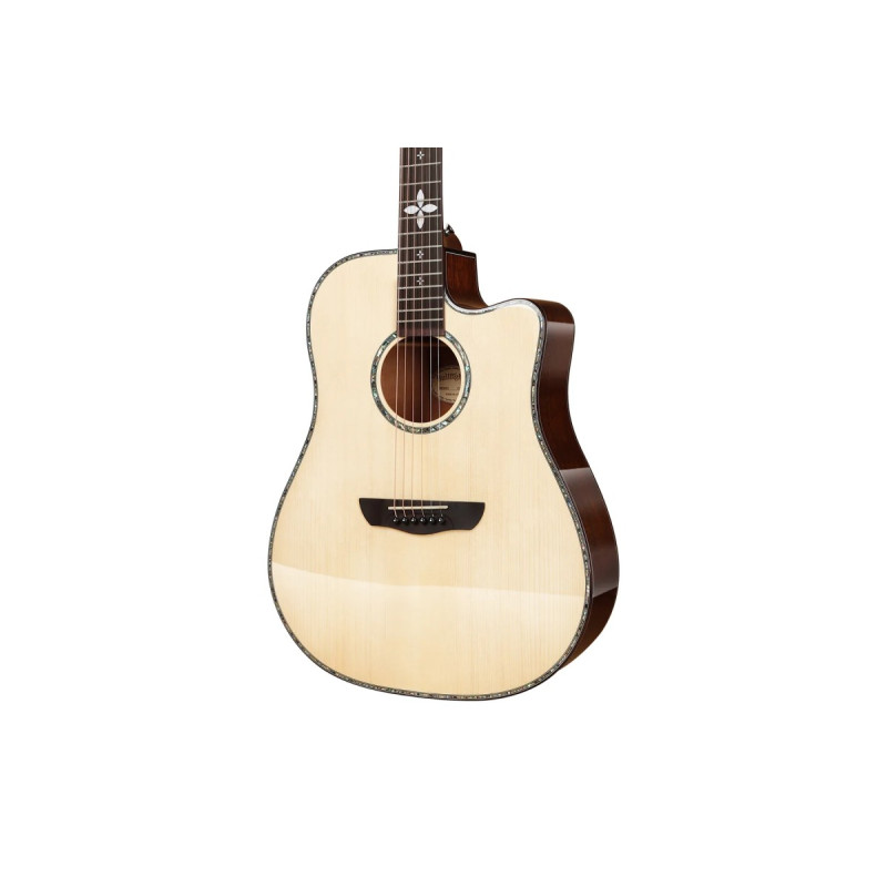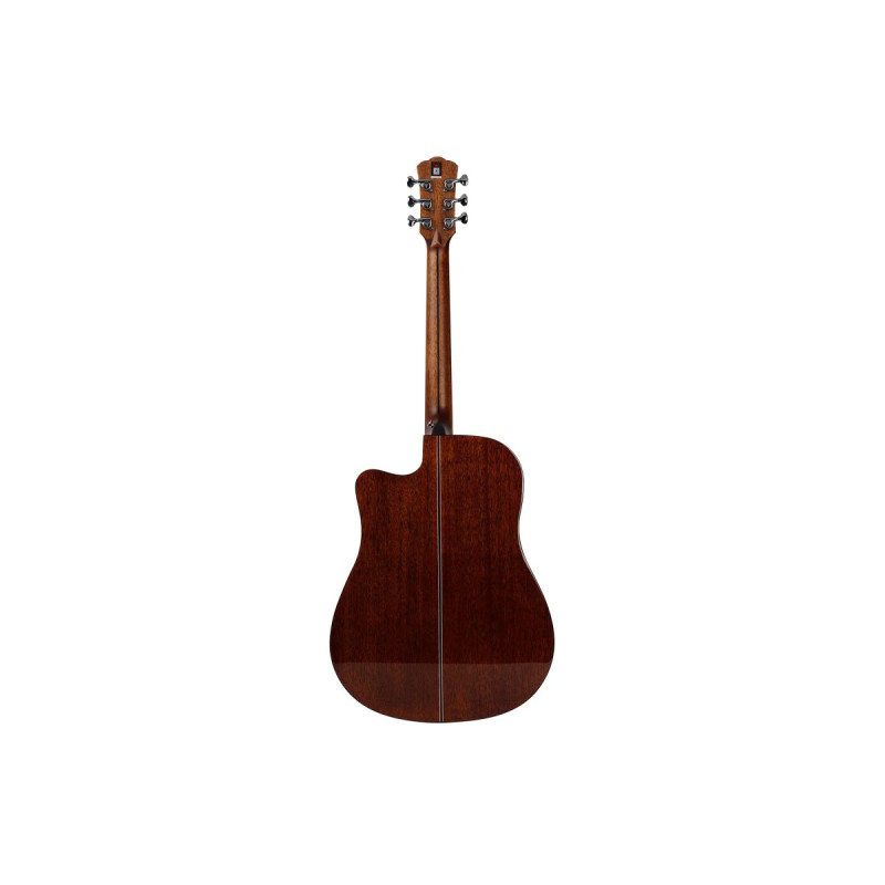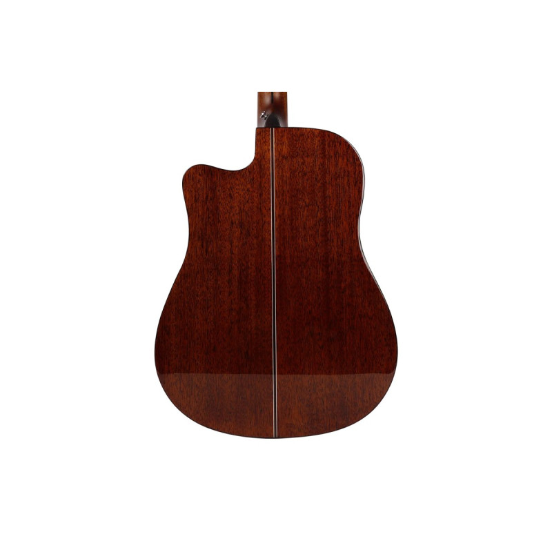 Корпус дредноута обеспечивает мощное звучание с акцентом на низкие частоты и сбалансированными верхами. Вырез не только добавляет гитаре эргономичности, но и слегка подчеркивает средние частоты, делая звук еще более артикулированным.