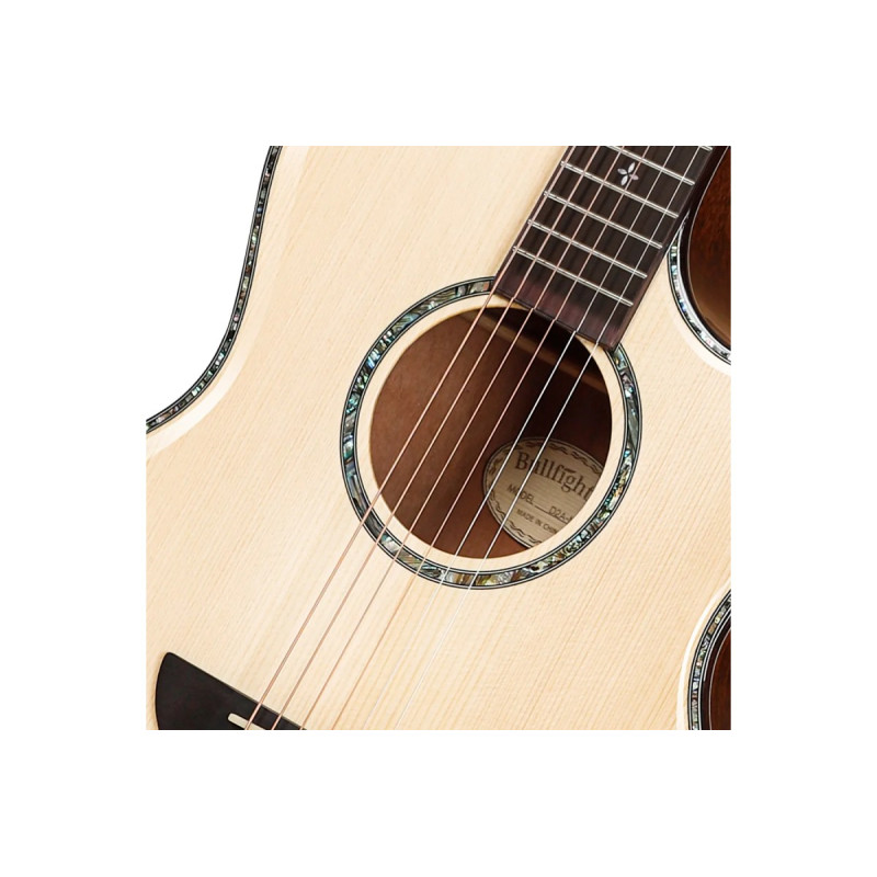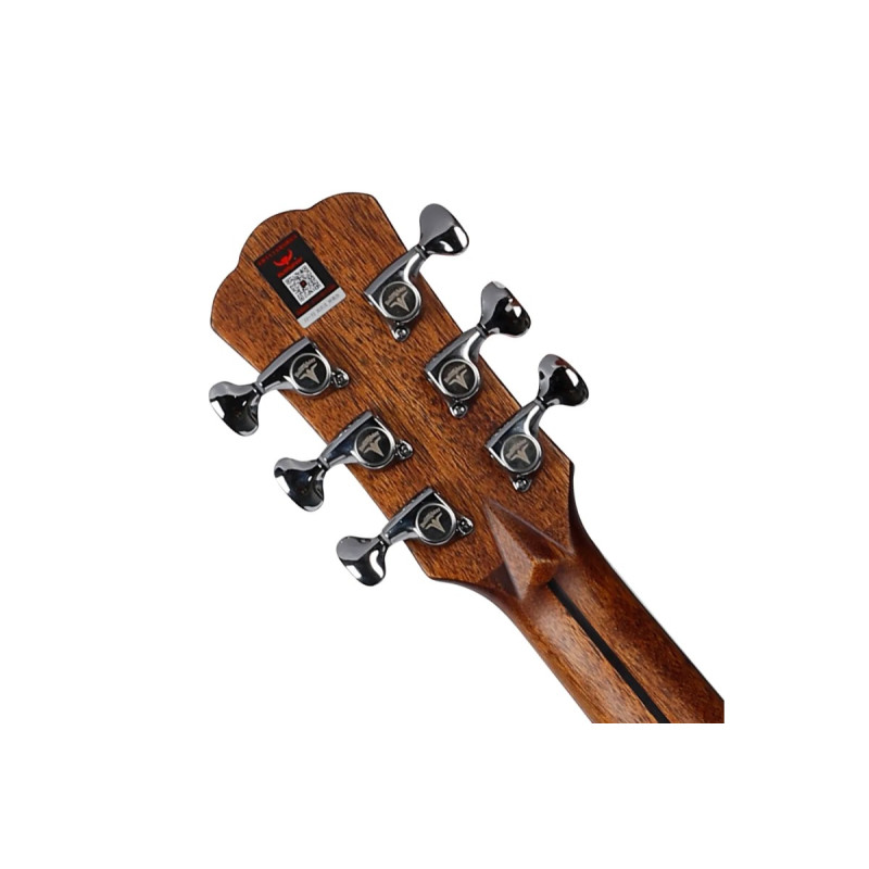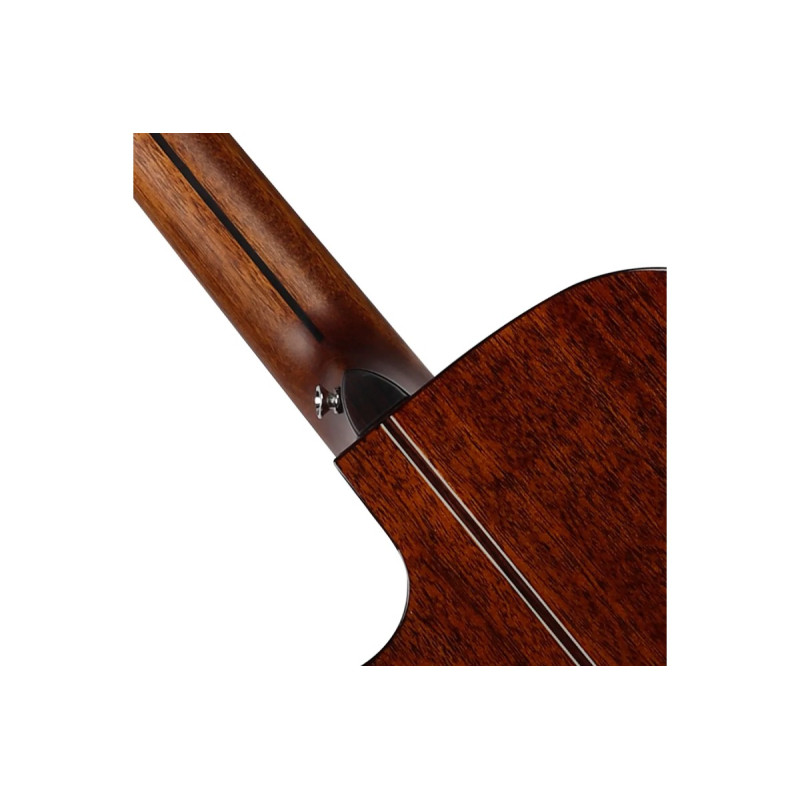 Гриф из красного дерева с декоративной вставкой из черного дерева обеспечивает стабильность конструкции и комфортную игру. Накладка грифа и бридж из палисандра способствуют точной интонации и передают богатый спектр обертонов. Ширина грифа 43 мм у верхнего порожка делают инструмент подходящим для музыкантов с разной техникой игры.