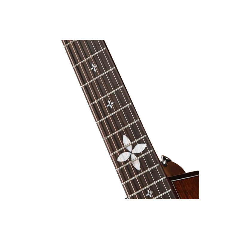 Эстетика гитары продумана до мелочей: изящные перламутровые маркеры в виде листьев лотоса на накладке грифа, инкрустация розетки и верхней деки выделяют внешний вид. Элегантная матовая отделка в натуральном цвете (Natural) подчеркивает естественную текстуру древесины.