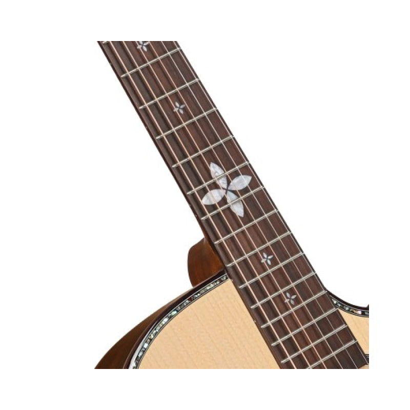 Изящные перламутровые маркеры в виде листьев лотоса на накладке грифа и богатая инкрустация розетки и верхней деки создают эстетичный образ. Глянцевая отделка в натуральном цвете (Natural High-gloss) выгодно подчеркивает благородную текстуру отборной ели и глубокий черный цвет эбенового дерева.