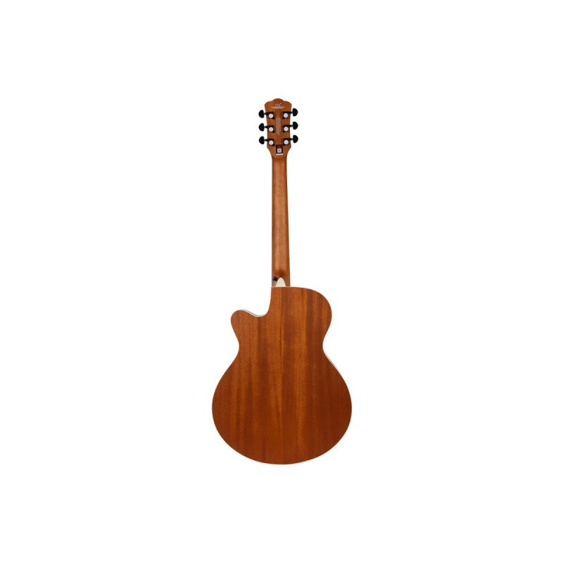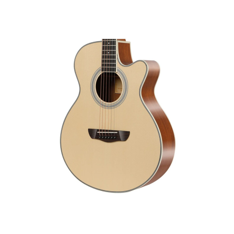 Верхняя дека из отборной ели формирует яркое и насыщенное звучание с четкой атакой и сбалансированным тембром. Нижняя дека и обечайки из ламината красного дерева (сапеле) придают звуку дополнительную теплоту и глубину, создавая при этом хорошую проекцию. Гриф из красного дерева гарантирует стабильность конструкции и приятные тактильные ощущения во время игры.