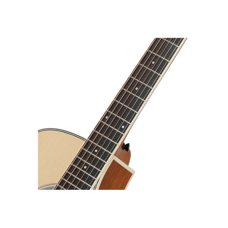 Накладка грифа и подставка из палисандра способствуют точной интонации и яркому резонансу. Прочная окантовка из ABS-полимера надежно защищает корпус и гриф от повреждений, а изящная интарсия верхней деки и розетки добавляет инструменту визуальной привлекательности.