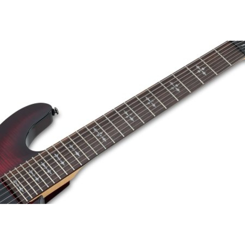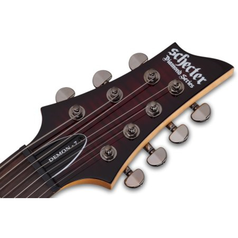 Demon-7 — идеальный инструмент для музыкантов, стремящихся к мощному звуку и выразительности. Эта 7-струнная гитара с корпусом из липы и выпуклым контуром верхней части обеспечивает отличную резонансность и комфорт в игре. Кленовый гриф с венговой накладкой, инкрустированной перламутровыми готическими крестами, не только выглядит эффектно, но и обеспечивает удобство при исполнении. С мензурой 26,5 дюймов и 24 ладами X-Jumbo, эта модель идеально подходит для игры в низком регистре. Тонкий "С"-образный профиль грифа и радиус накладки 16" делают игру легкой и приятной. Оснащенная двумя звукоснимателями Schecter Diamond Active HB-105S и бриджем Tune-O-Matic, Demon-7 предлагает широкий диапазон звуковых возможностей. Черная хромированная фурнитура придает гитаре стильный вид, а отделение для 9V батарейки обеспечивает удобство использования активных звукоснимателей.