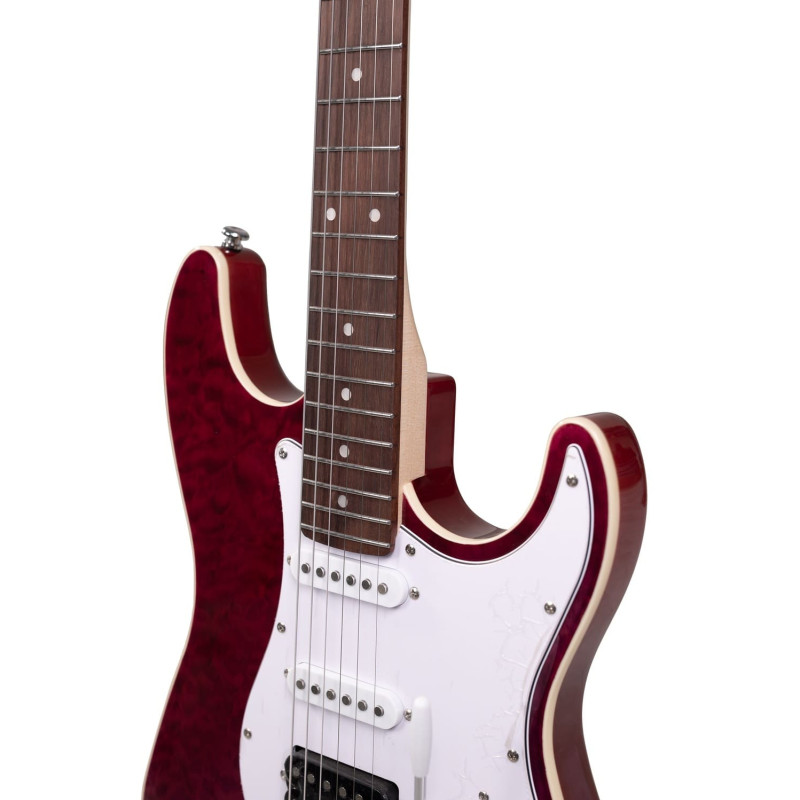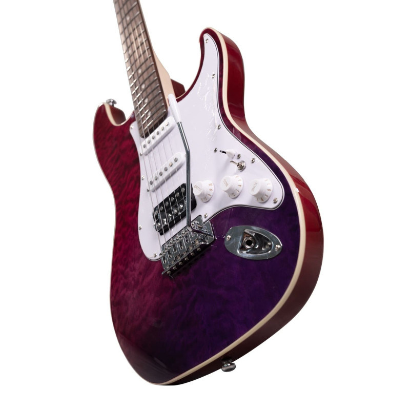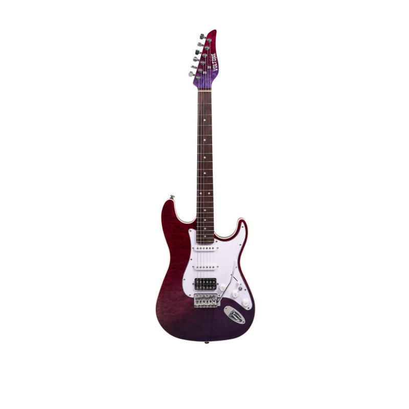 Электрогитара Voltone ST60-QV-SPB – универсальный инструмент для учебных классов, репетиционных баз, студий звукозаписи и прокатных компаний, где важны стабильность, предсказуемое звучание и надежная конструкция при ежедневной эксплуатации. Корпус из агатиса с кленовым топом формирует сбалансированный характер звука и аккуратную атаку, а кленовый гриф с палисандровой накладкой и С-образным профилем обеспечивает комфорт при длительных сессиях и быстрой смене позиций. Мензура 25,5" и 22 лада подходят для обучения, кавер-проектов и универсальных сценических задач. Конфигурация звукоснимателей HSS на магнитах Alnico 5 с пятипозиционным переключателем, общей ручкой громкости и двумя регуляторами тембра позволяет гибко адаптировать тембр под разные стили – от чистых партий до плотных ритмов. Тремоло-бридж расширяет выразительные возможности, а двойной регулируемый анкер повышает стабильность строя. Атласно-фиолетовый корпус с хромированной фурнитурой подчеркивает современный внешний вид. В комплекте чехол, что удобно для логистики и оптовых поставок. Праворукая версия.
