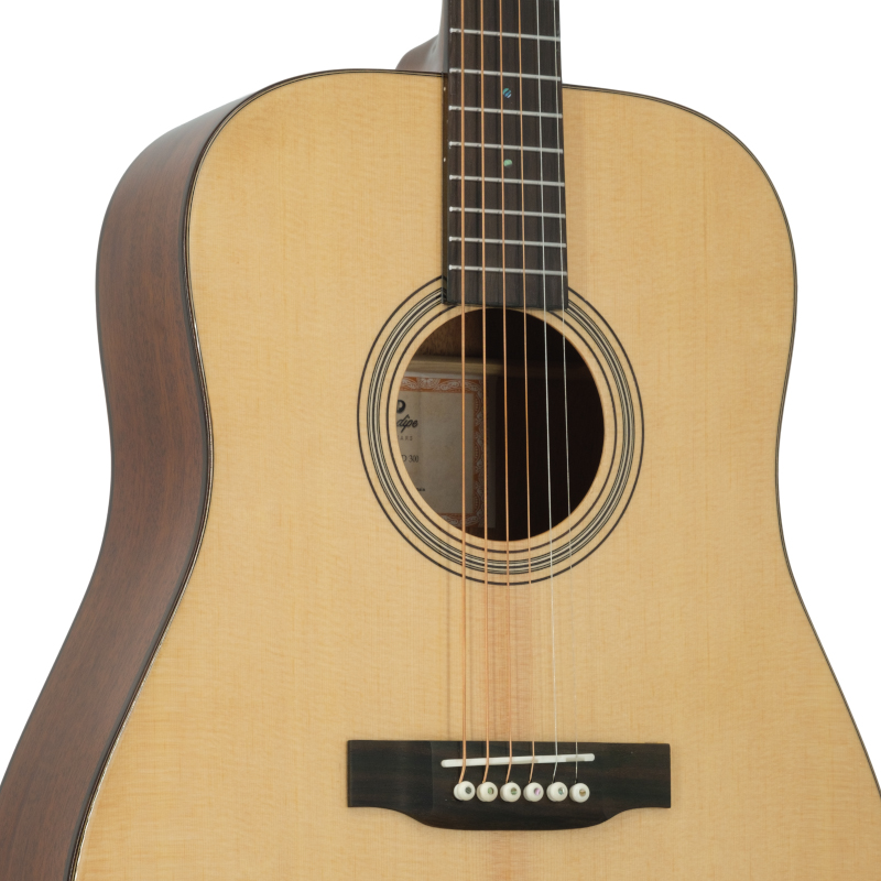 Форма дредноута, верхняя дека из немецкой ели АА, нижняя дека и обечайки из массива красного дерева и превосходное качество древесины для мощного, яркого и точного звука. Накладка грифа из палисандра и стальные лады обеспечивают безупречную долговечность и превосходный комфорт при игре!