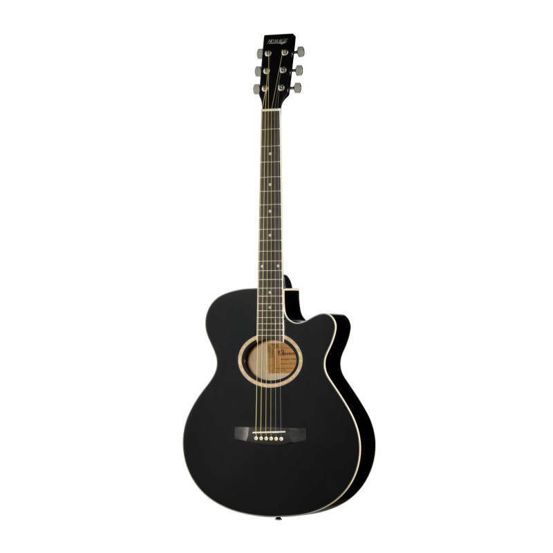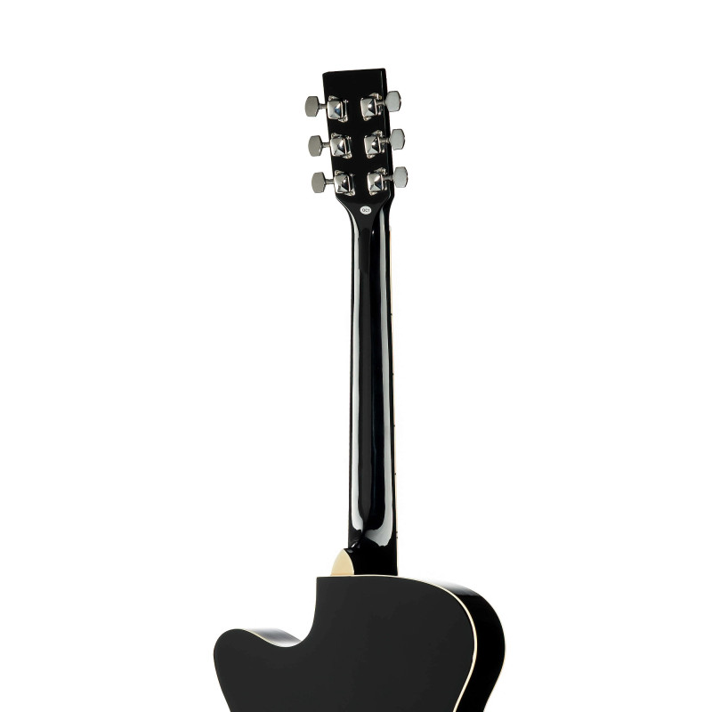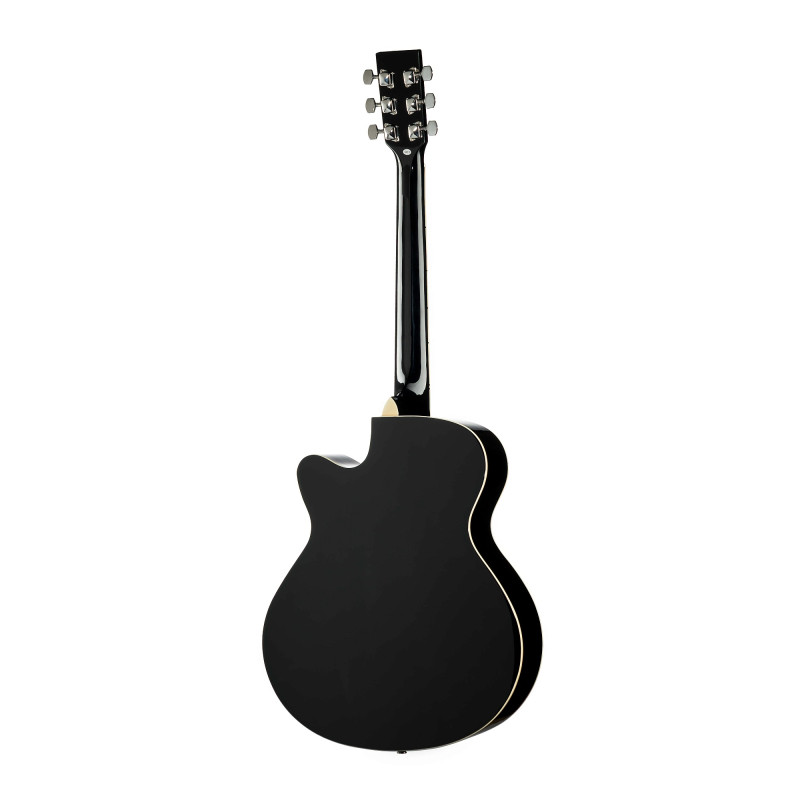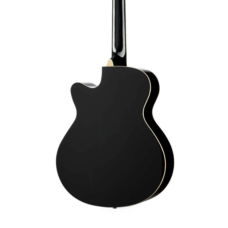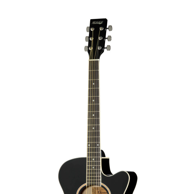 LF-401C-B Фольковая 6-струнная гитара 40" с вырезом. Верхняя дека - ламинат ели, задняя дека и обечайки - ламинат, гриф - клен, накладка грифа - палисандр, бридж - палисандр, колковая механика - хромированная, окантовка - 5-слойный кант, цвет- черный. HOMAGE