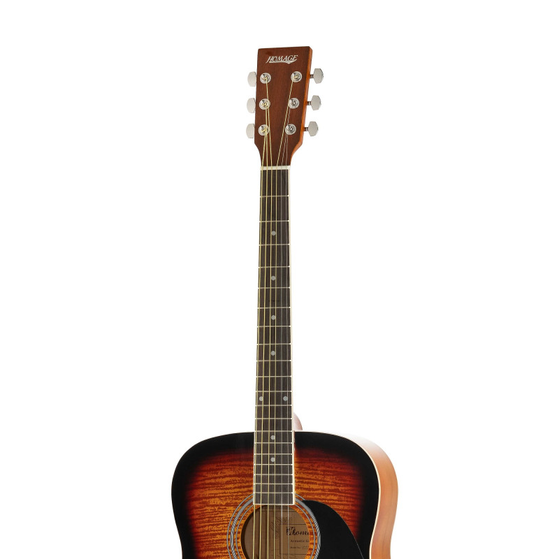 LF-4110T Акустическая 6-струнная гитара 41". Верхняя дека - ламинат ели, задняя дека и обечайки - ламинат липы, гриф - катальпа, накладка грифа - палисандр, бридж - палисандр, колковая механика - хромированная, окантовка - пластик, цвет - тигровый санберст. HOMAGE
