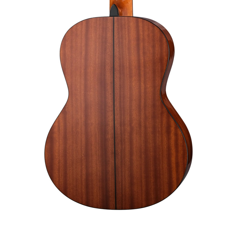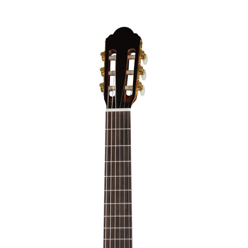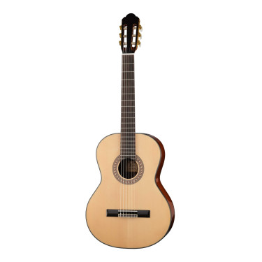 Размер: 39'' Классическая гитара. Верхняя дека: массив ситкинской ели. Задняя дека и обечайка: сапеле. Накладка на гриф и бридж: палисандр. Позолоченные колки, 3 в ряд.