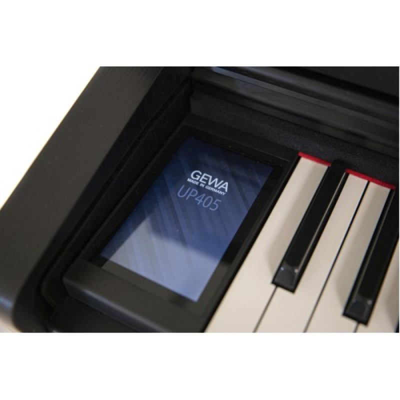 Управление всеми функциями и параметрами осуществляется с помощью крупного сенсорного дисплея, весь функционал интерактивен, нагляден и всегда под рукой. USB-интерфейс позволяет не только связать инструмент с компьютером для цифровой звукозаписи или интеграции в DAW, но и загружать обучающие библиотеки, и демо. Также USB поддерживает воспроизведение аудиофайлов с внешнего носителя. Кроме того, GEWA UP405 поддерживает потоковую передачу аудиоданных и USB-MIDI, соединяюсь по беспроводной Bluetooth связи с мобильными гаджетами на iOS или Android.