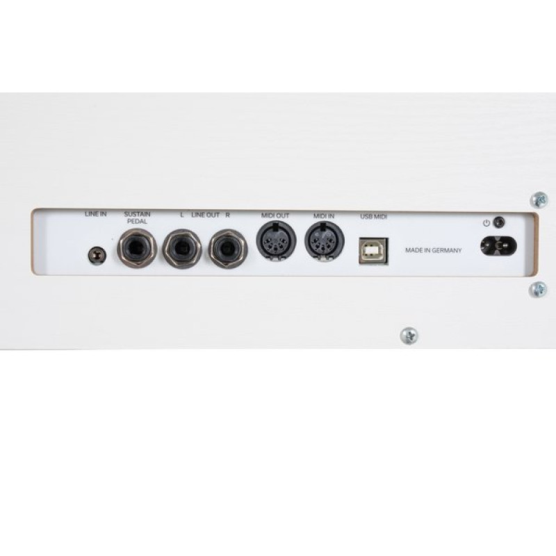 • Разъёмы: DIN MIDI вход/выход, Линейный вход (стереоразъем 3,5 мм), Линейный выход L/R (два 6,3-мм разъема), 2 разъема для наушников, USB, Педаль сустейна