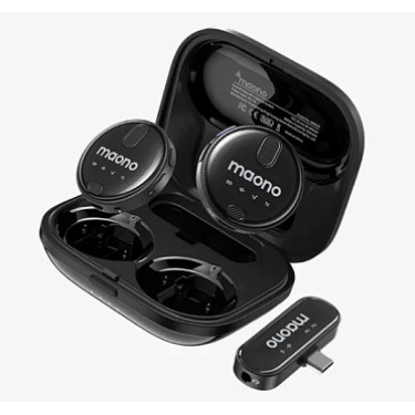 Maono WM620 ультракомпактная двухканальная накамерная беcпроводная система, микрофон передатчик- 2 шт, микрофон приемник -1 шт, зарядный кейс, USB-C кабель для зарядки, руководство пользователя.