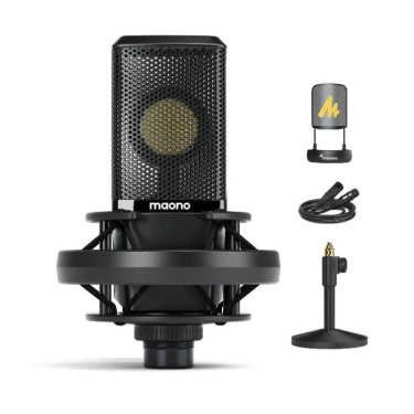 Maono AU-PM500Т микрофон студийный, конденсаторный кардиоидный. Антивибрационное крепление, подставка настольная, поп-фильтр, XLR кабель длинной 2.5 м. Капсюль 34 мм., 20 Гц-20 кГц, -35дБ. Макс.