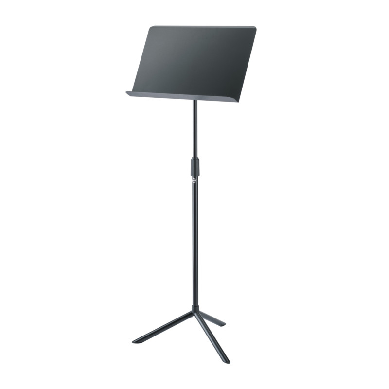 Инновационный оркестровый пюпитр с бесступенчатой регулировкой высоты (фрикционный замок). Чтобы отрегулировать высоту от 750 до 1280 мм, трубы стойки просто раздвигают или снова раздвигают. Для больших и тяжелых нотных книг весом более 2,5 кг высоту можно дополнительно зафиксировать, затянув зажимную втулку. Большая металлическая подставка для нот размером 500 x 320 мм покрыта прочным текстурированным покрытием. Угол наклона также плавно регулируется, а большие ударопоглощающие резиновые торцевые заглушки обеспечивают устойчивость и надежность пюпитра.