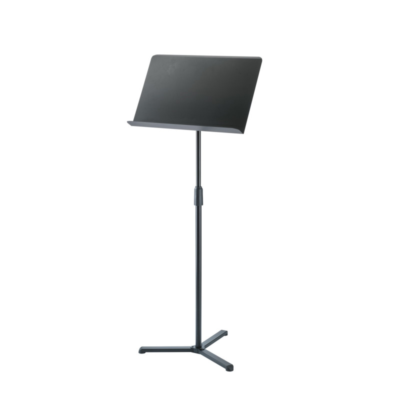Стильный оркестровый пюпитр с бесступенчатой регулировкой высоты (фрикционный замок). Чтобы отрегулировать высоту от 653 до 1185 мм, трубы стойки просто раздвигают или снова раздвигают. Для больших и тяжелых нотных книг весом более 2,5 кг высоту можно дополнительно зафиксировать, затянув зажимную втулку. Большая металлическая подставка для нот размером 500 x 320 мм покрыта прочным текстурированным покрытием. Угол наклона также плавно регулируется, а большие ударопоглощающие резиновые торцевые заглушки обеспечивают устойчивость и надежность пюпитра. Плоская конструкция основания чрезвычайно компактна и может быть отвинчена для транспортировки.