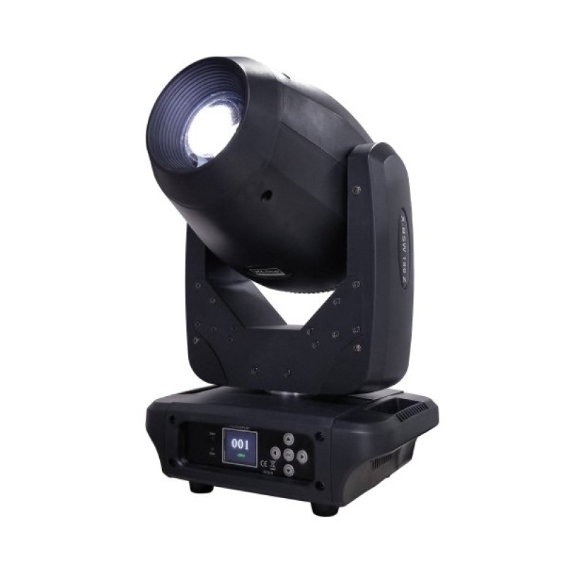 Световой прибор полного вращения с одним светодиодом белого цвета мощностью 150 Вт обладает рядом уникальных характеристик. Колесо цвета предлагает 7 различных цветов плюс открытый цвет, а также эффект радуги. Колесо статичных гобо содержит 9 различных гобо плюс открытый режим окно, с возможностью использования эффекта гобо-шейк. Колесо вращающихся гобо предлагает 6 гобо плюс открытый режим и также поддерживает эффект гобо-шейк. Прибор оснащен 3-фасеточной призмой, которая вращается в обоих направлениях, а также функцией Zoom для регулировки размера изображения. Дополнительно имеется стробо эффект с частотой от 0 до 20 Гц.