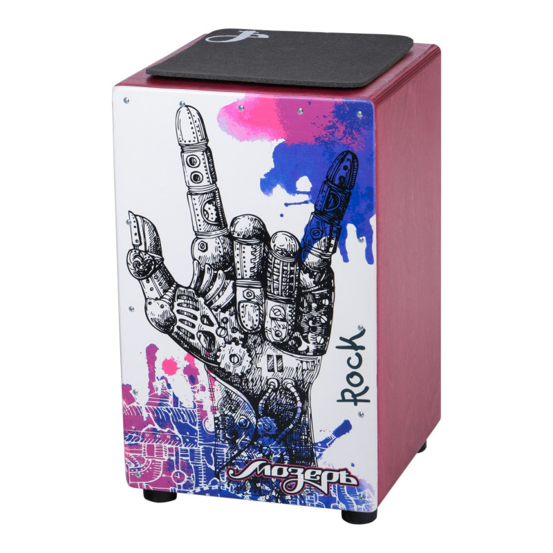 Кахон с глубоким басовым звучанием в сочетании с тонким звуком гитарных струн, резонаторная сторона из березы 3мм, регулируемая система натяжения струн, цвет корпуса бордо, тапа с принтом рок.