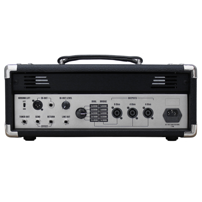 Для инструментов с мощными звукоснимателями предусмотрен аттенюатор -15 dB для исключения перегрузки сигнала по входу, о которой сообщает индикатор CLIP. На задней панели расположены: выход сигнала на тюнер TUNER OUT, последовательная петля эффектов SEND и RETURN, выход чистого сигнала в обход усилителя DI-OUT с регулировкой уровня LEVEL DI-OUT, выход сигнала с преампа LINE OUT, а также гнезда SPEAKON для подключения кабинетов сопротивлением 8 или 4 Ом.
