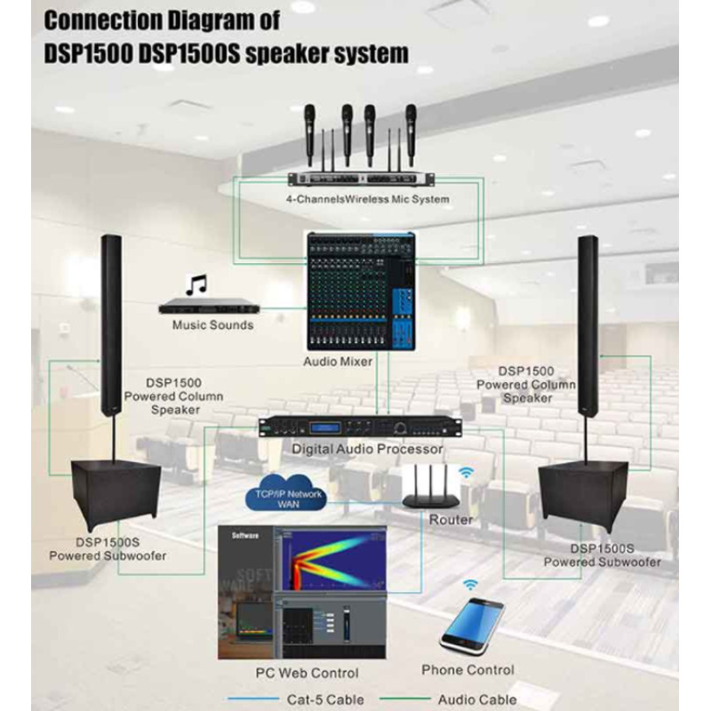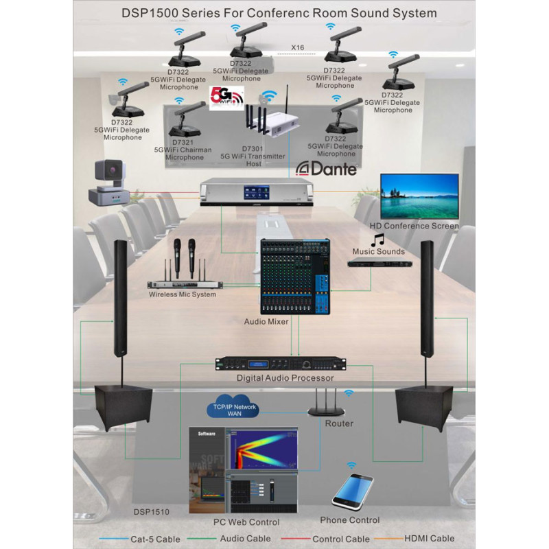 Для использования в различных сценариях подключите активную акустическую систему DSP1500 и сабвуфер DSP1500S.