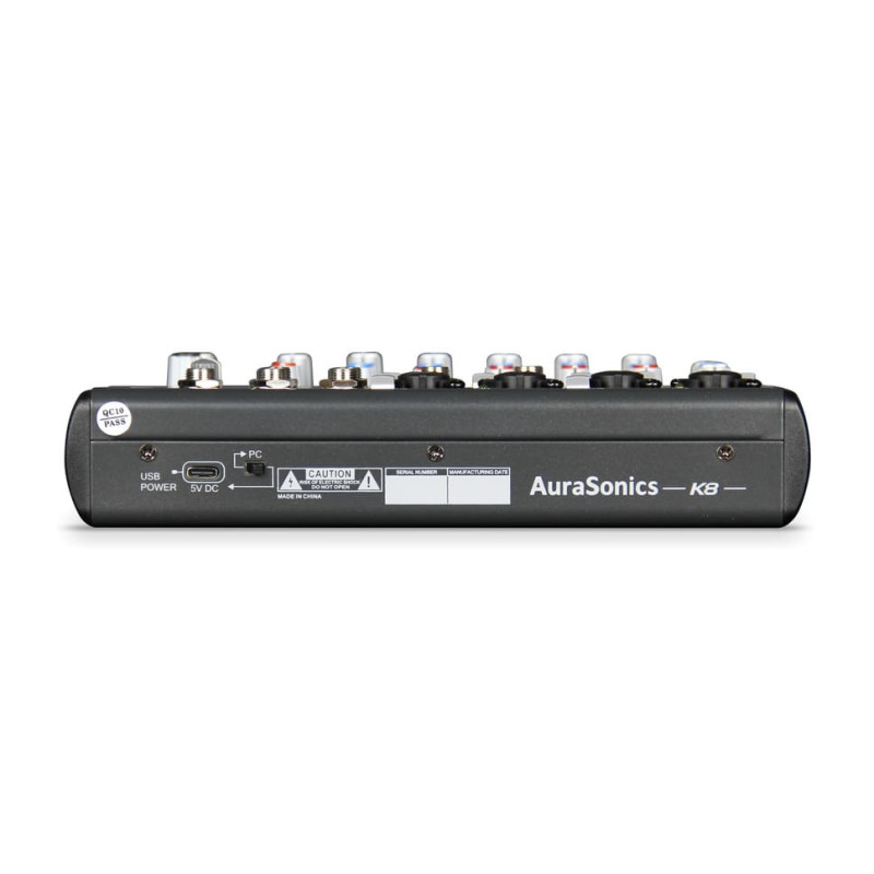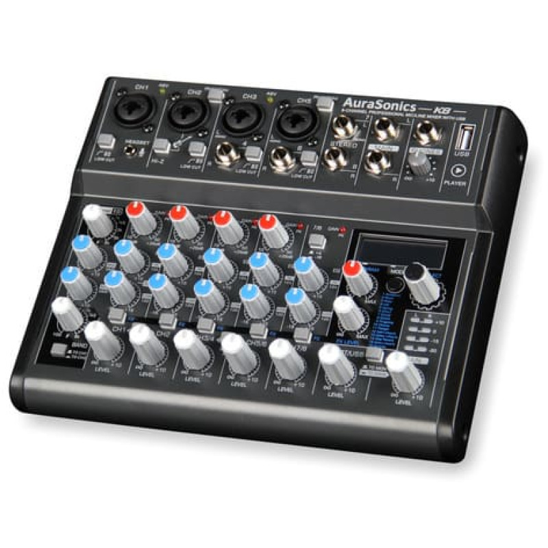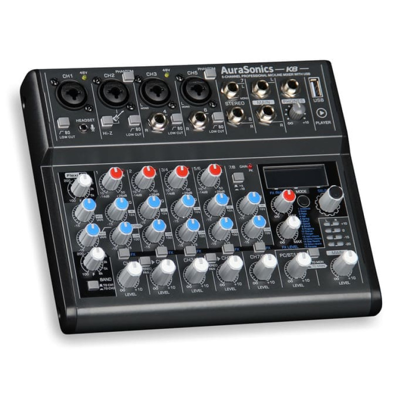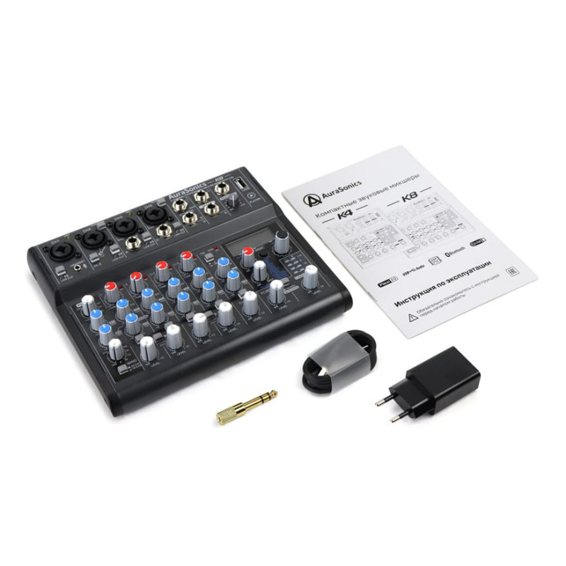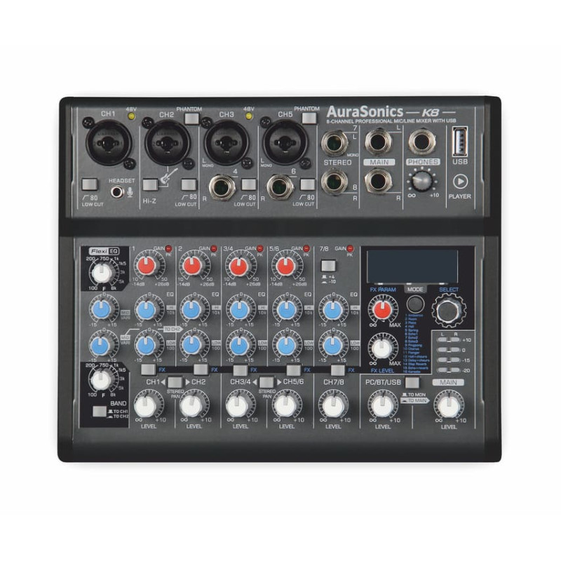AuraSonics K8 компактный микшерный пульт 2 мик.+2 мик.моно/линейных стерео+1 лин.стерео+FXстерео+дополнительный стереоканал со встроенных источников Bluetooth/PC-Audio/USB-плеер, параметрический эквалайзер FlexiEQ