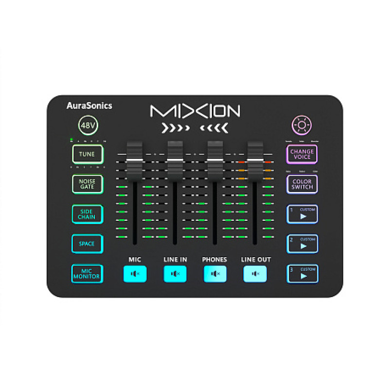 AuraSonics MIXION USB-аудиоинтерфейс, микшер, для геймеров и стримеров, 4 фейдера, кнопки MUTE, эффекты изменения голоса, реверберация, дакинг, джингл плеер