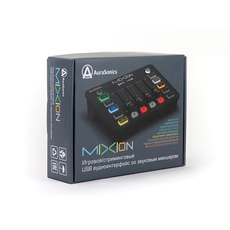 Модель AuraSonics MIXION представляет собой комбинированное устройство, сочетающее одновременно функции звукового USB-интерфейса и цифрового микшера. Его сновным назначением является работа со звуком в прямом эфире во время стримов или игр. Также устройство может быть с успехом использовано для записи подкастов, аудиокниг и т.д.