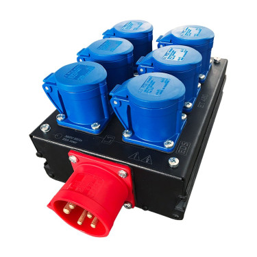 В корпусе осуществлена коммутация от вилки CEE 32A 5-pol. до встроенных розеток PCE CEE16A 3-pol. по две на каждую фазу, а также сквозная коммутация до выходной розетки CEE 32A 5-pol.